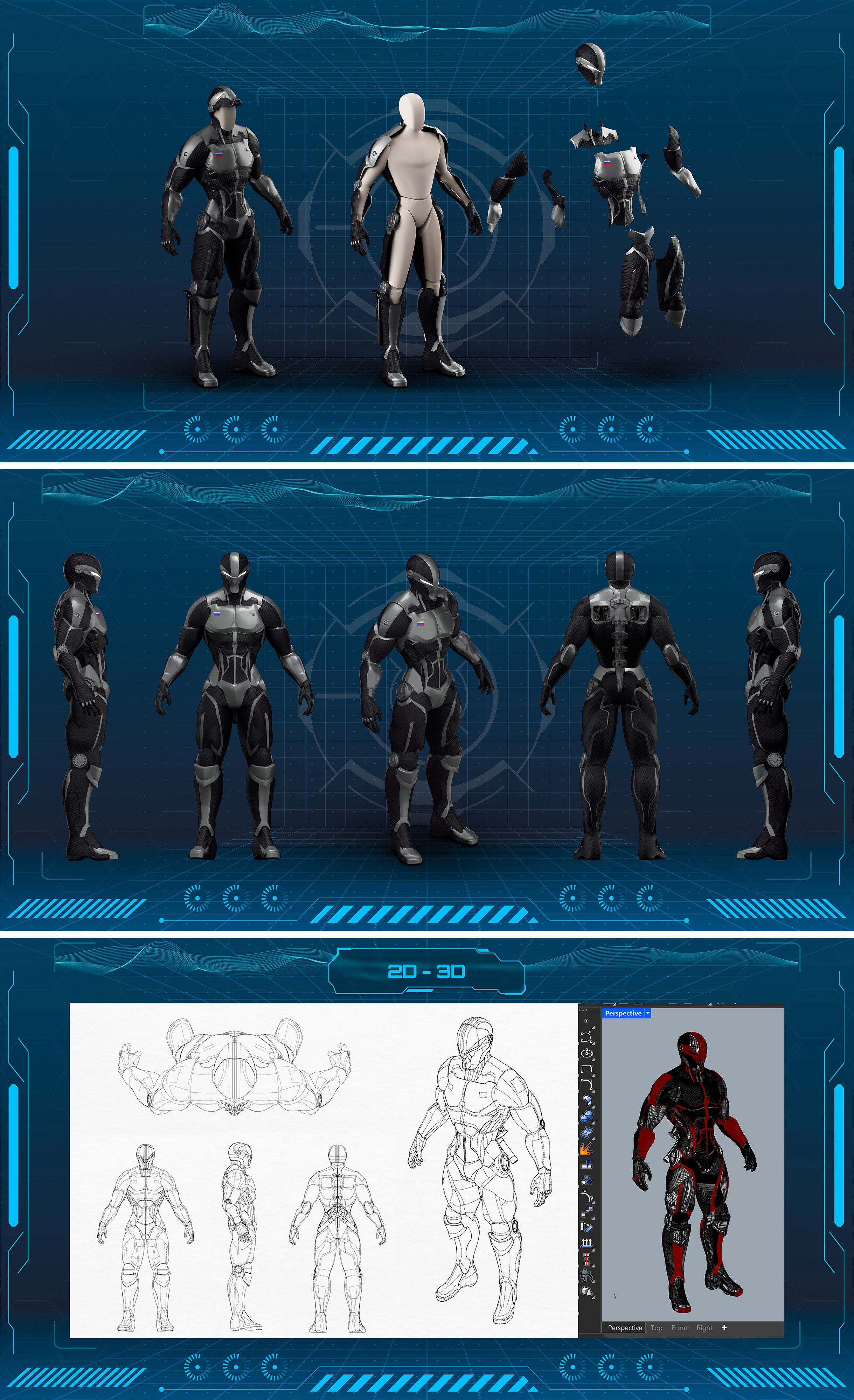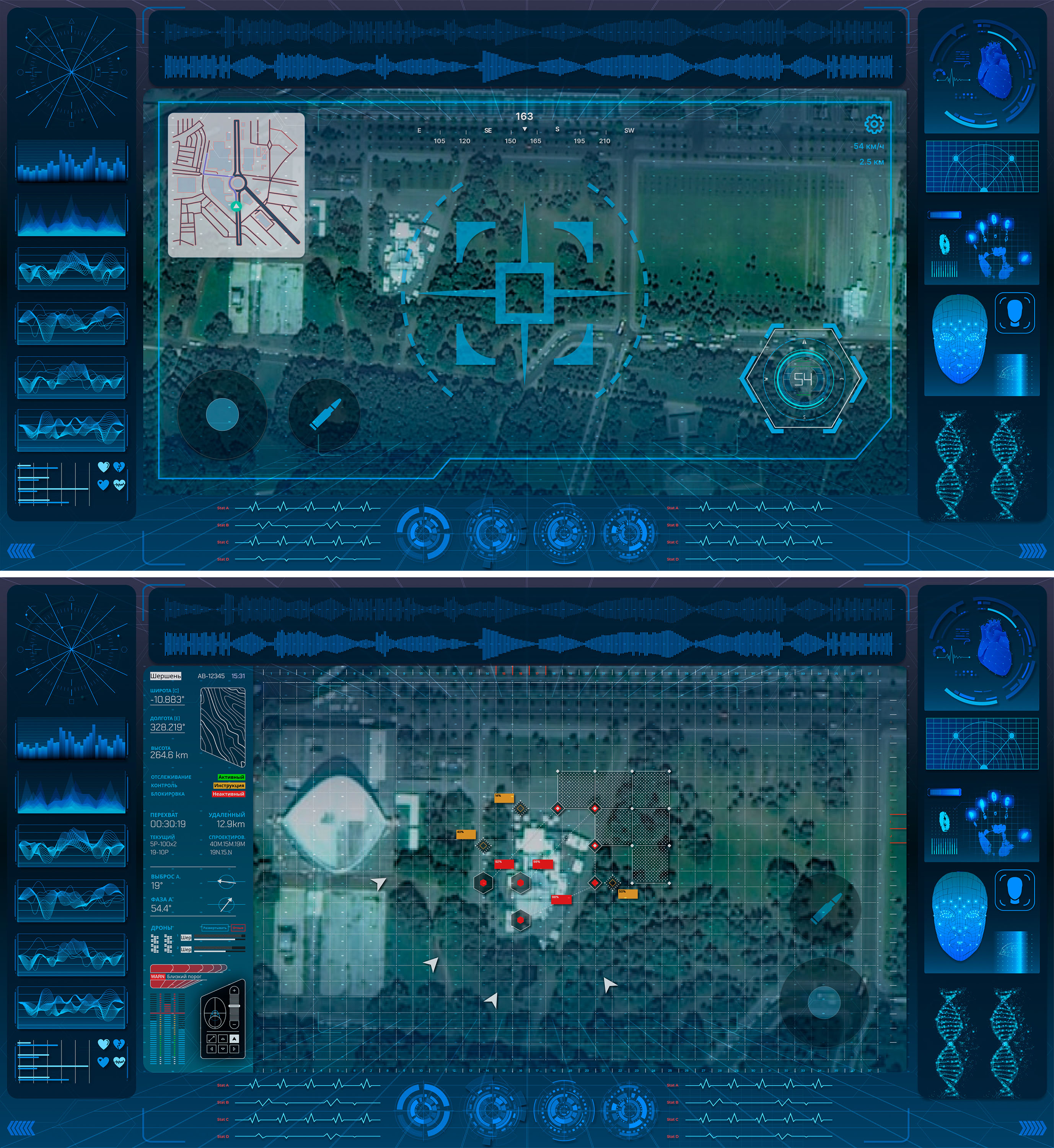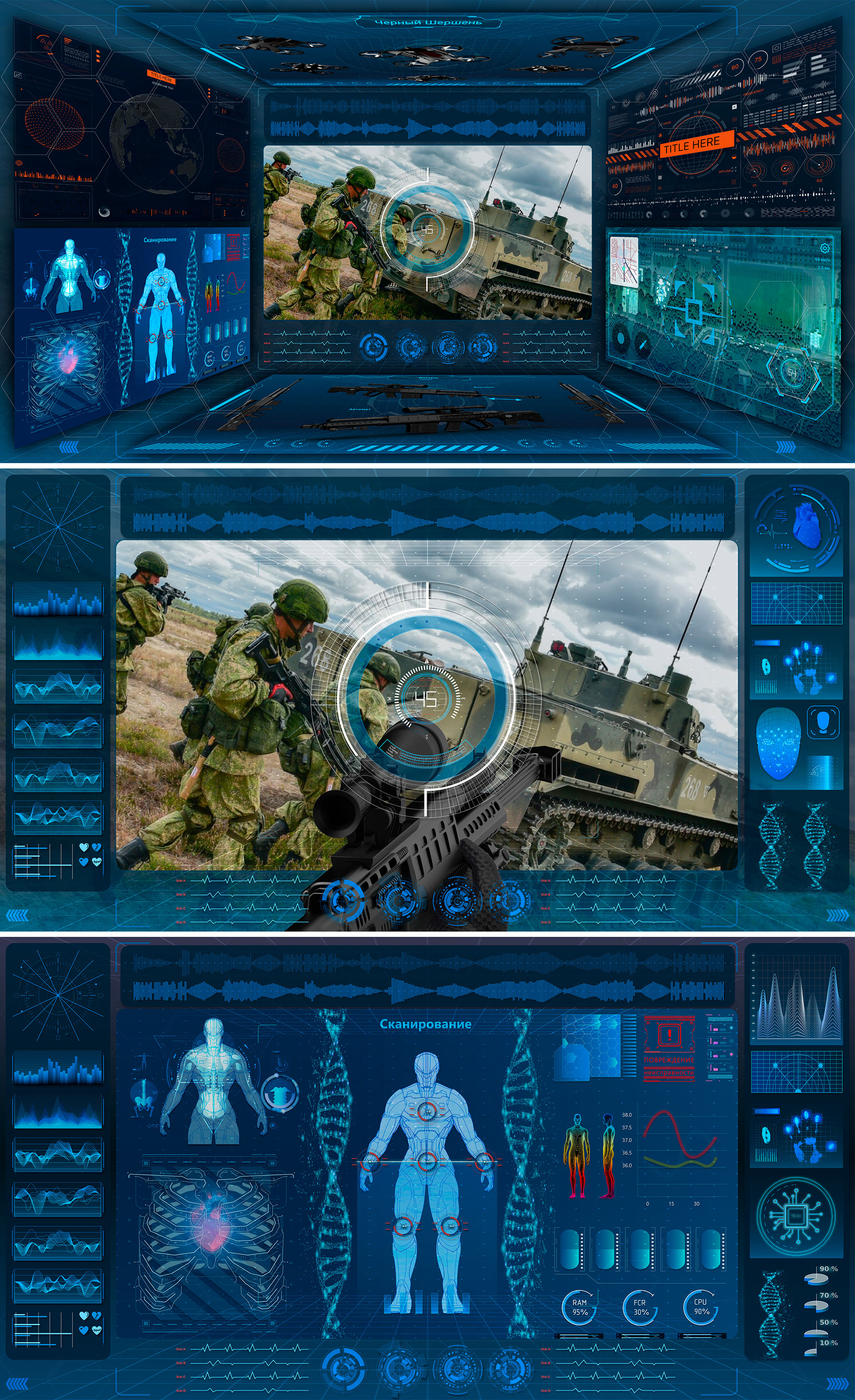 UI строится вокруг тактильного шлема и проекционного дисплея. Интерфейс минималистичен, интуитивно понятен и предоставляет оператору только ключевую информацию в режиме реального времени: статус систем, карту местности, цели, данные с дронов и т.д. Управление голосовыми командами и нейроимпульсами позволяет максимально сосредоточиться на боевой задаче.