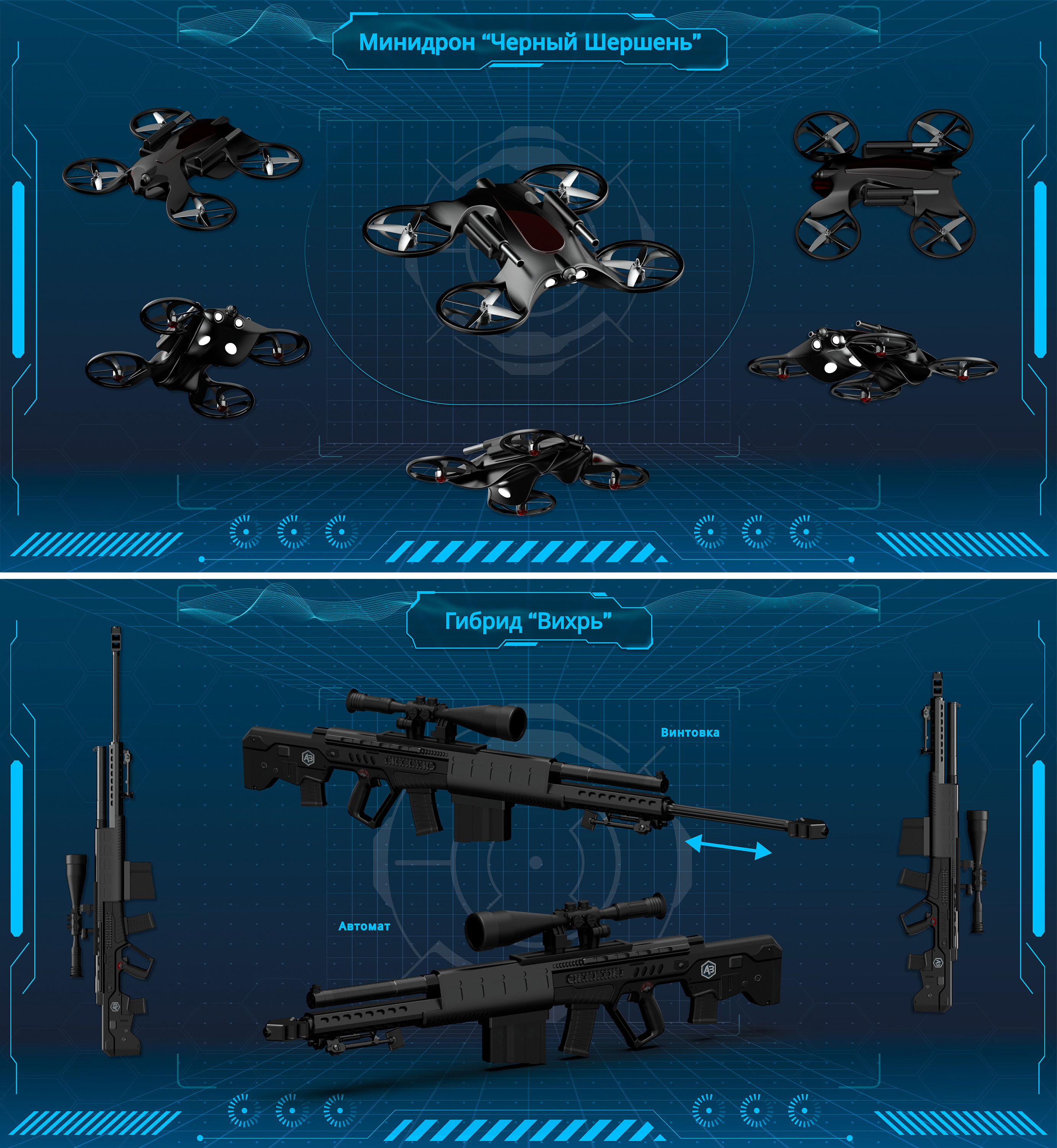 5. Гибридная оружейная система «Вихрь»: Модульное оружие, сочетающее в одном корпусе функции автомата для ближнего боя и снайперской винтовки для поражения целей на большой дистанции.