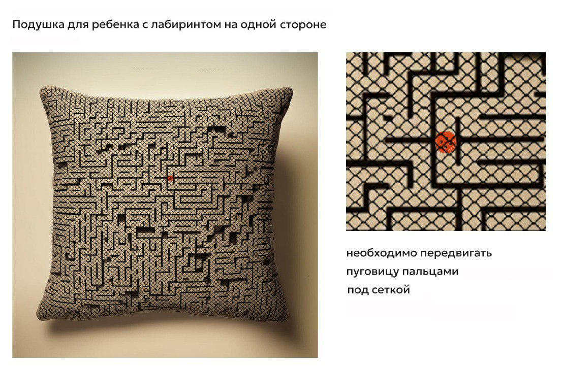 Детская игровая подушка "Лабиринт": два в одном. Авторы: магистрант 54.04.01 "Дизайн" Померанцев Максим Алексеевич, руководитель: доктор искусствоведения, профессор Макарова Татьяна Львовна, дизайнер.