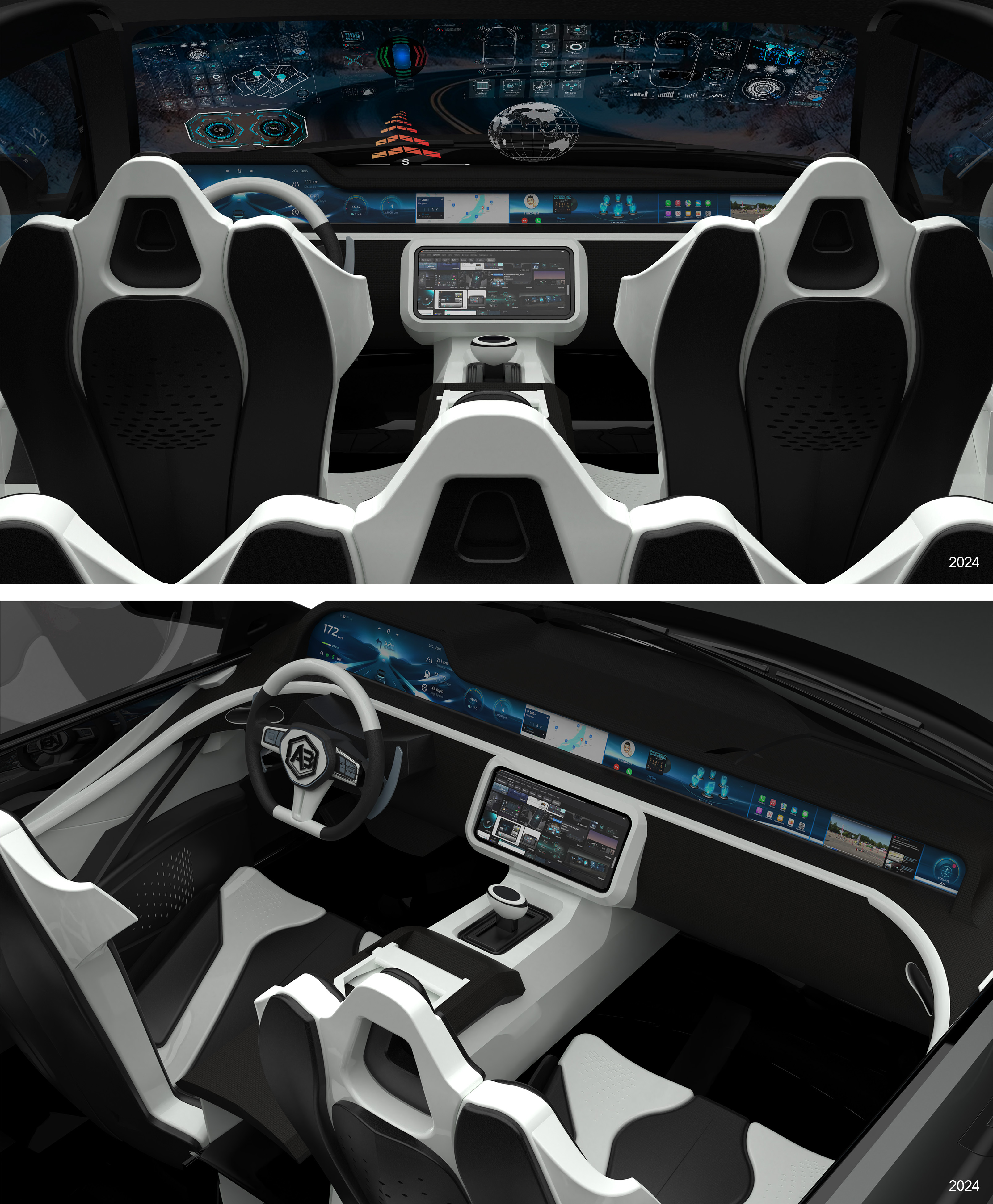 HMI UI: Бесшовный интерфейс объединяет центральный голографический дисплей с AR-проекцией на лобовое стекло. Минималистичная кинетическая графика и интеллектуальная визуализация данных создают эффект цифровой гармонии, превращая вождение в высокотехнологичный опыт.
